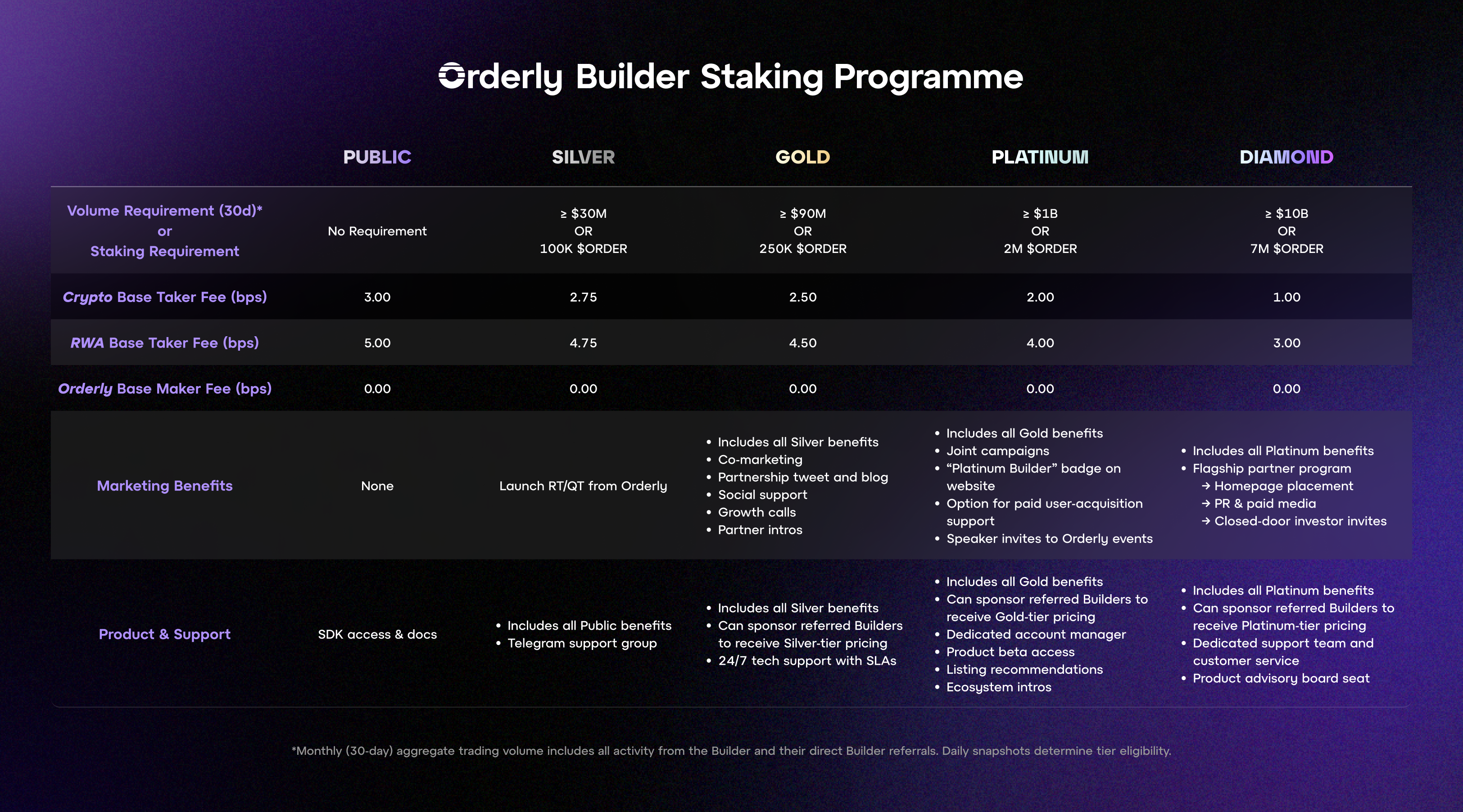 - Base fee tiers: The base fee Orderly charges you depends on your tier in the Builder Staking programme.